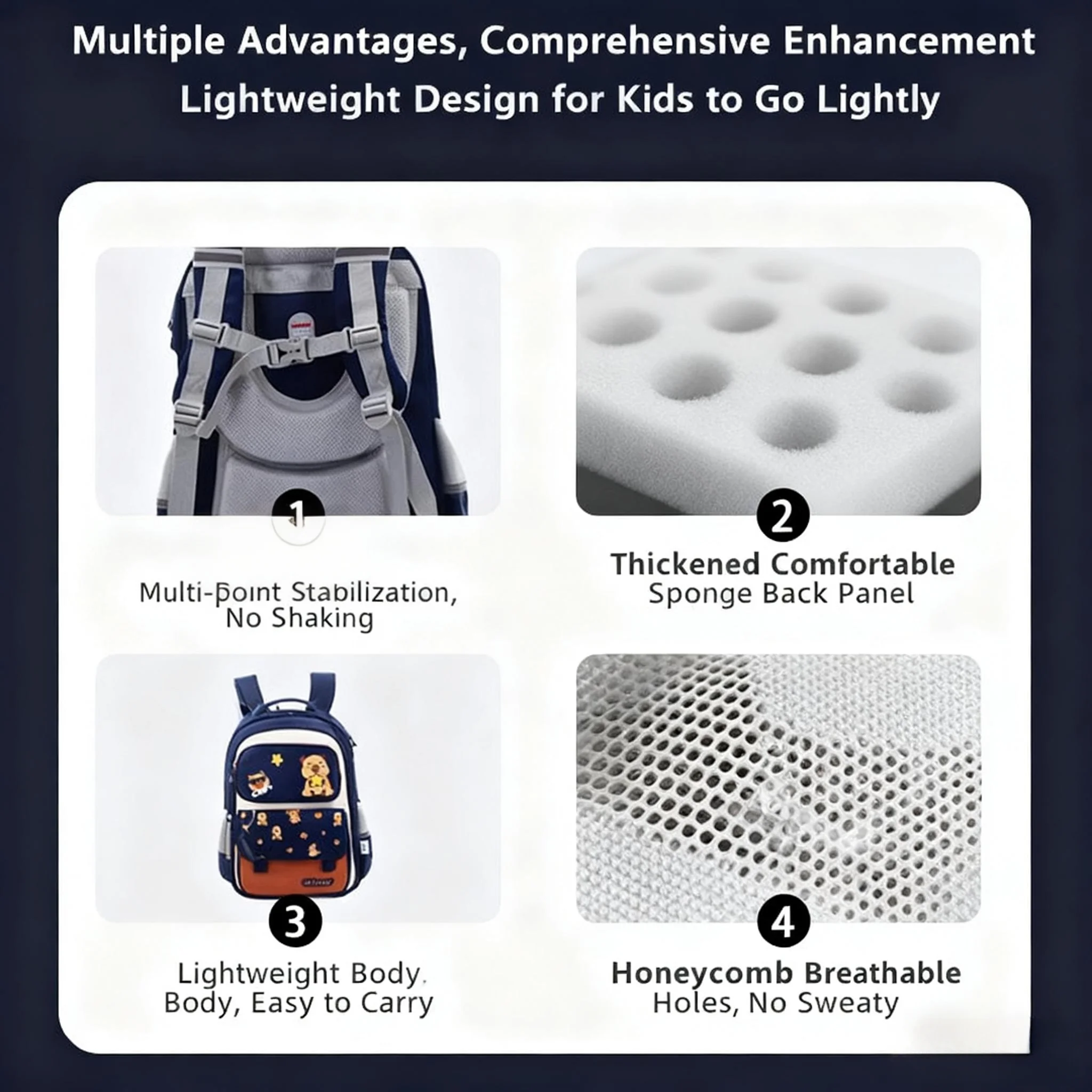 The backpack features a weight reduction design, making it lightweight and comfortable to carry for extended periods.